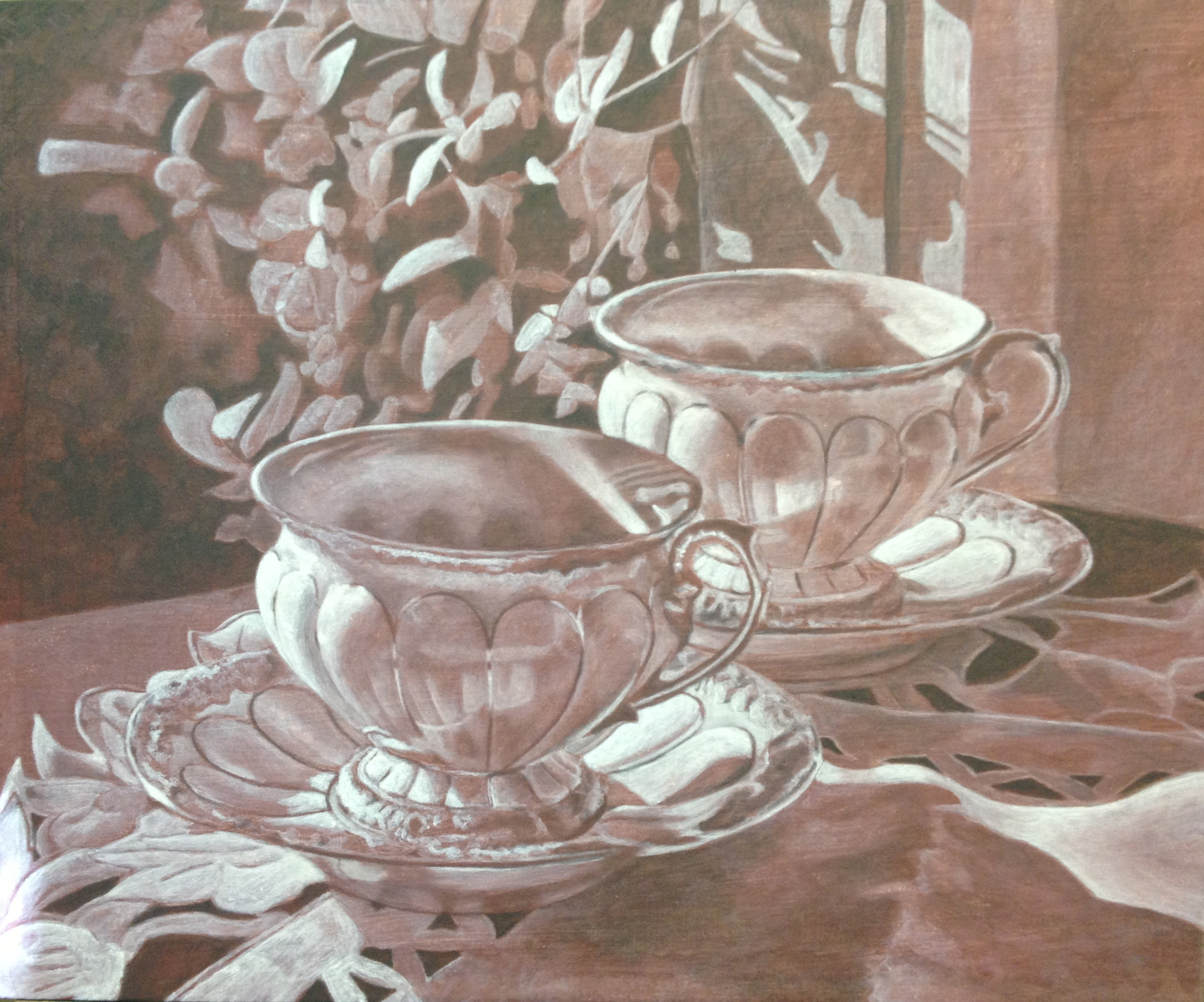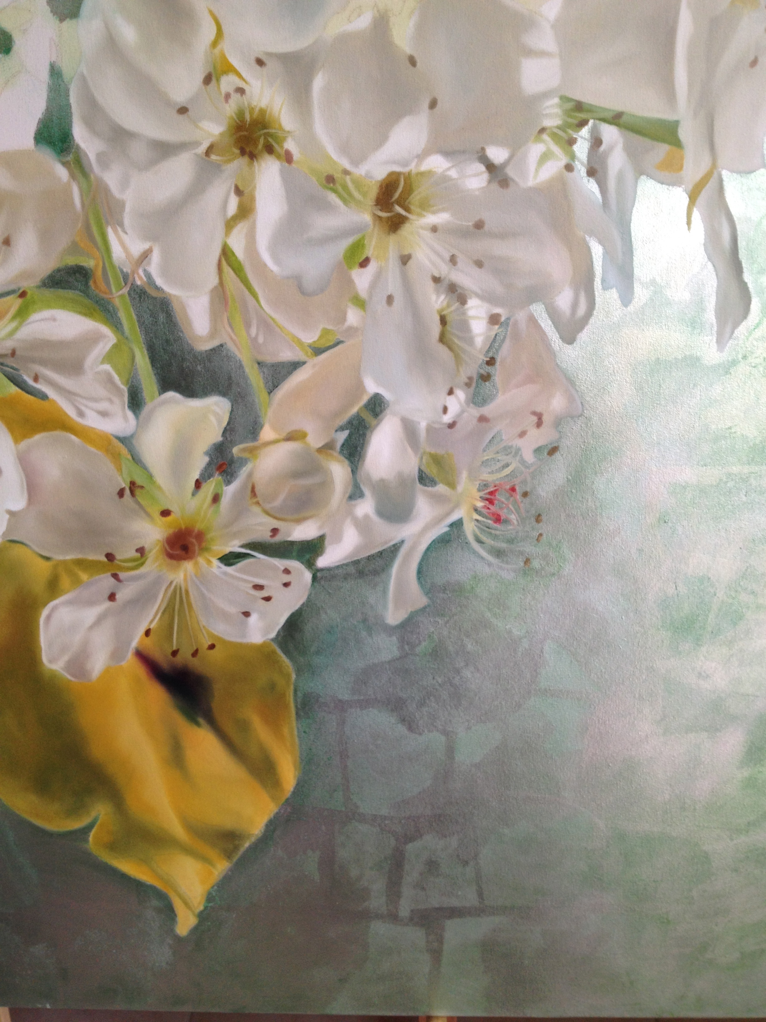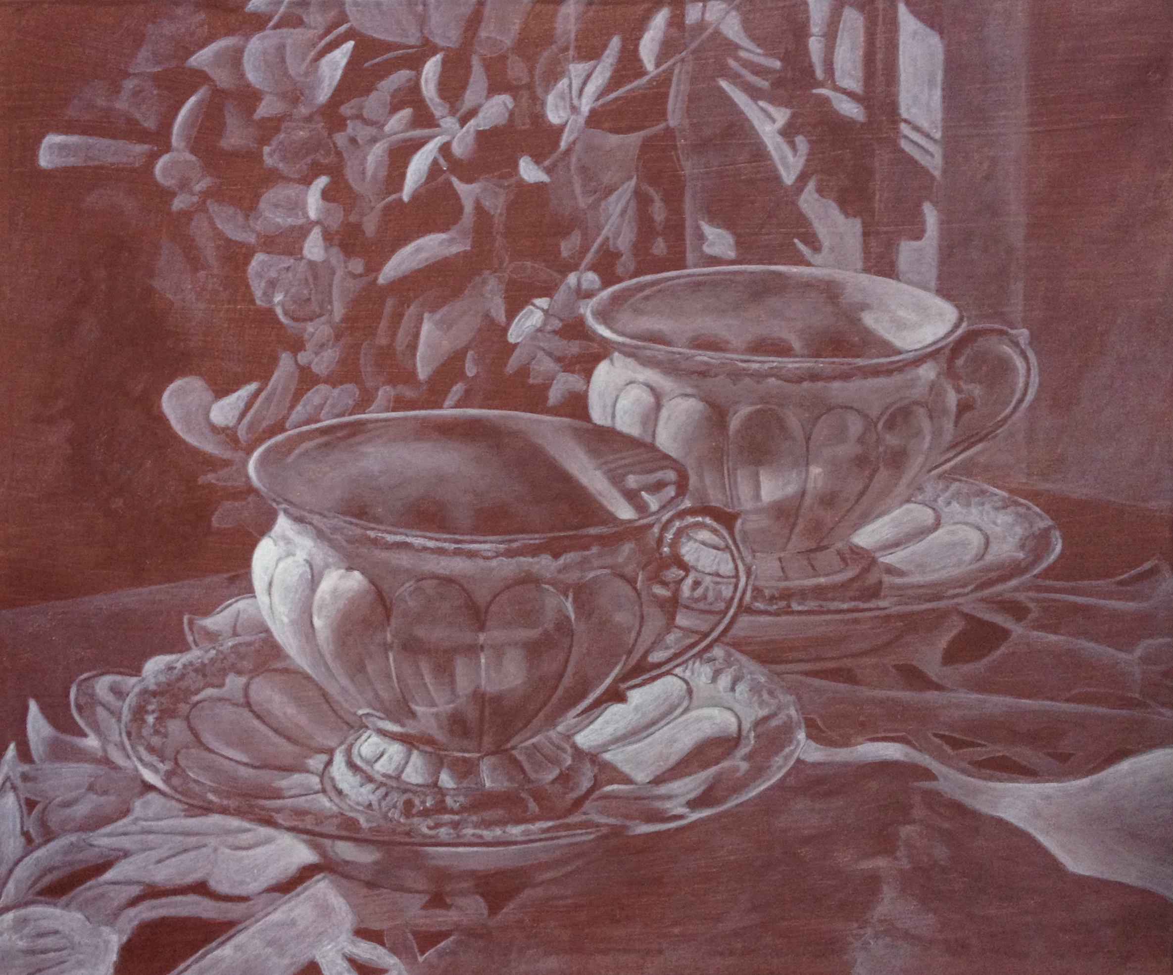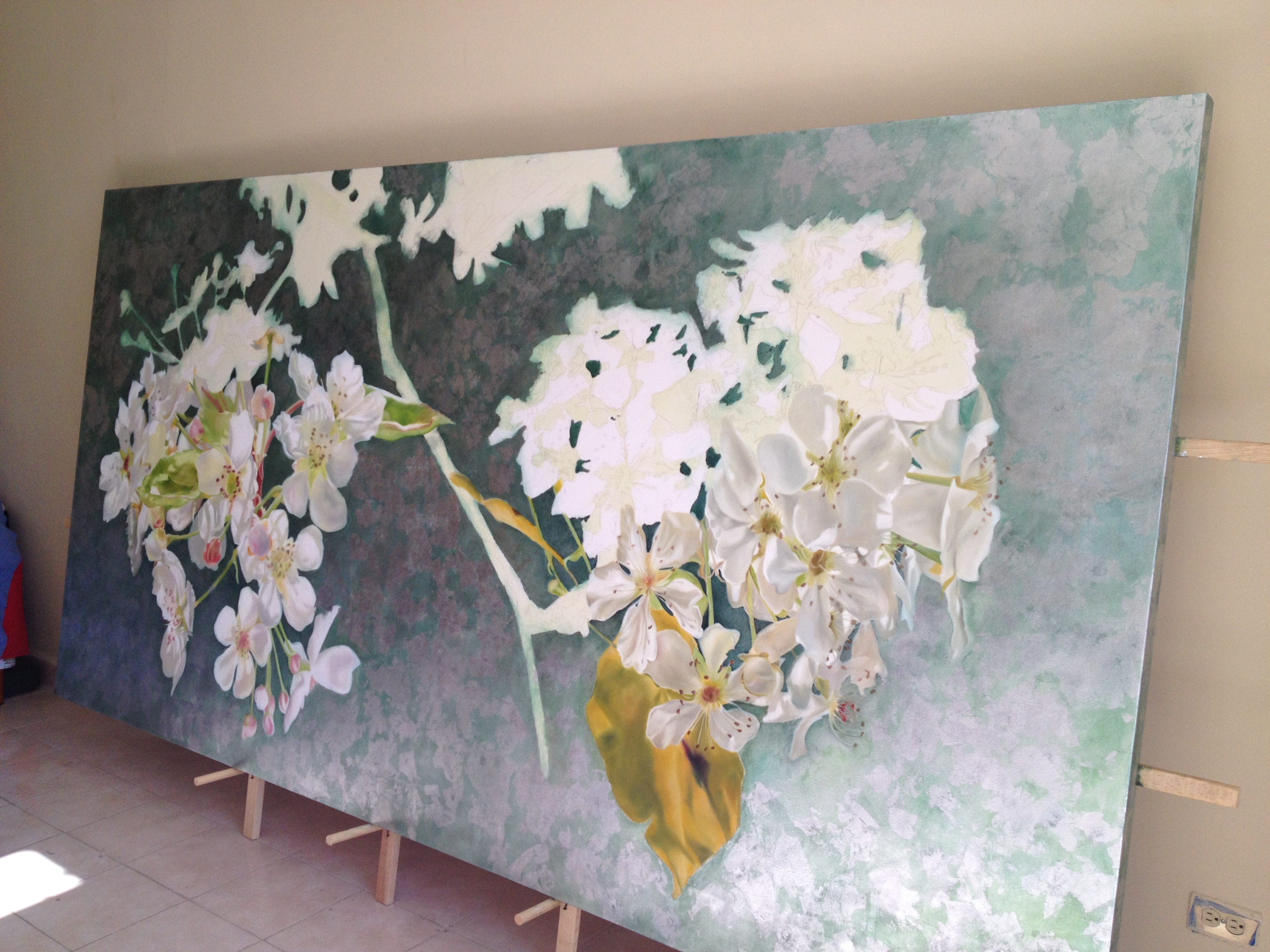 Oleo/creta. Técnica utilizada: Generar una grisalla, intensificar blancos, agregar colores en veladoras construidas con blanco.