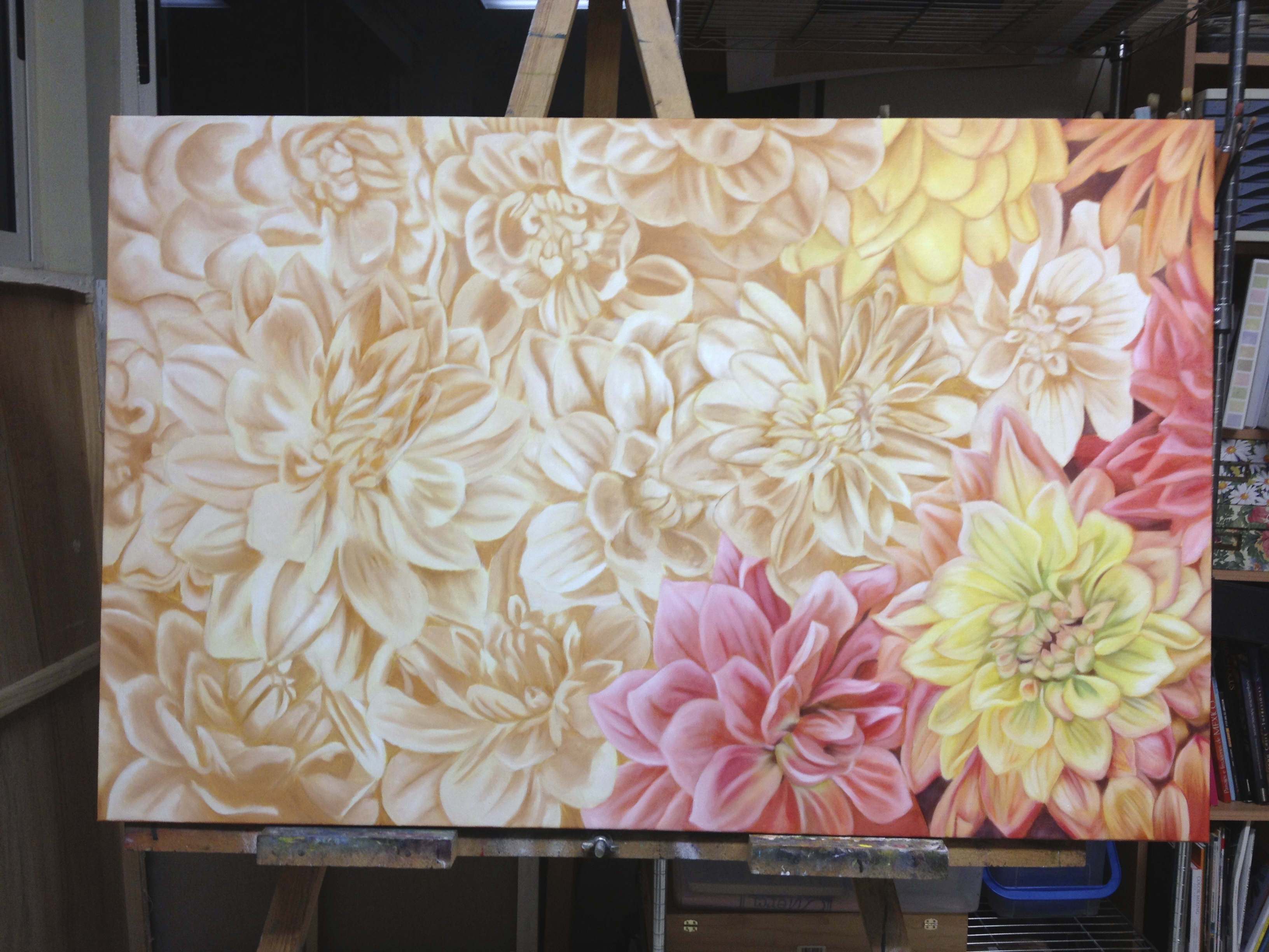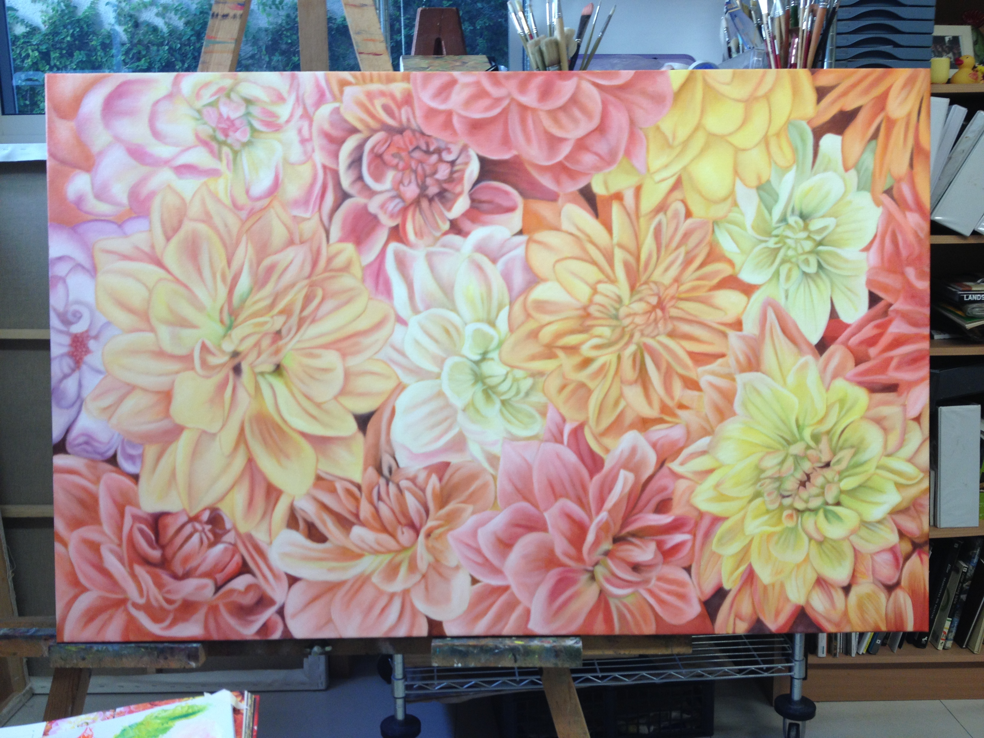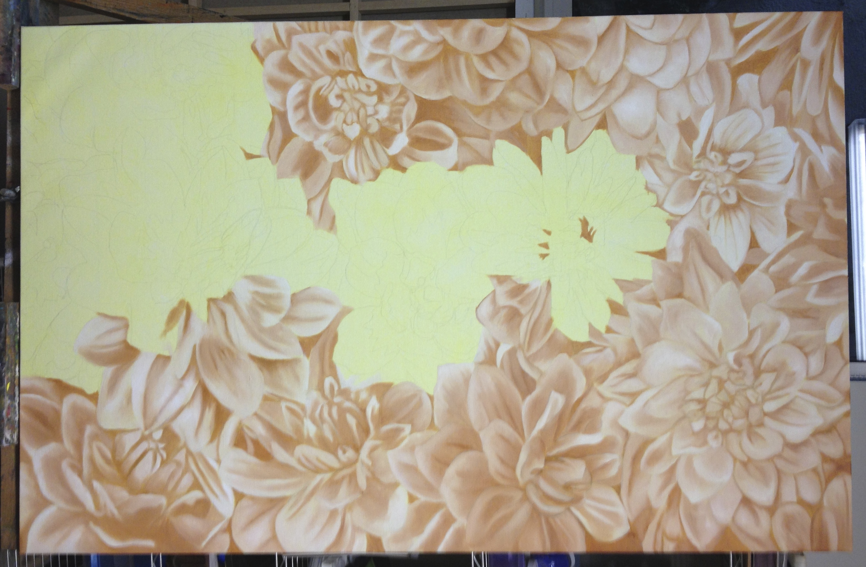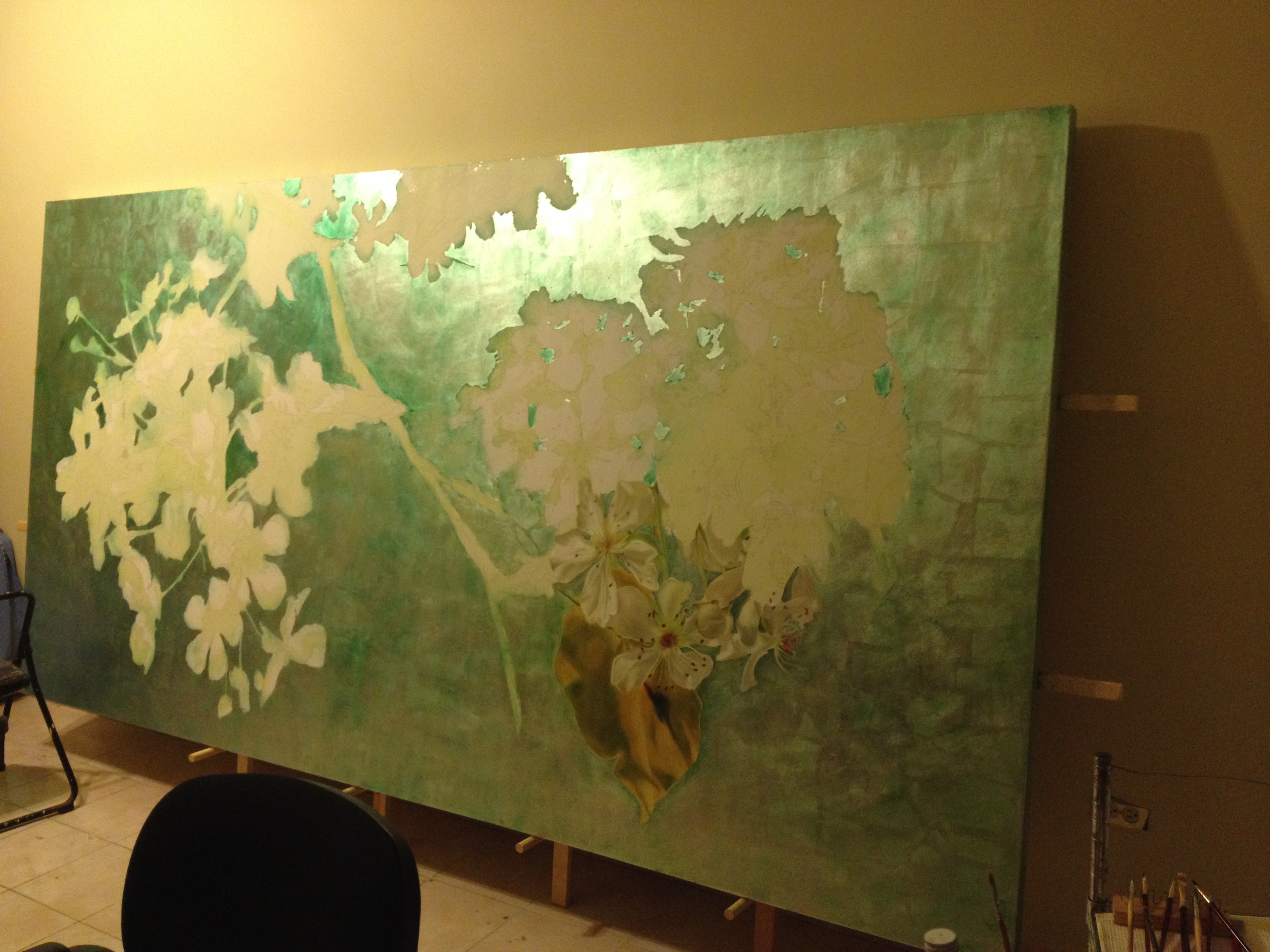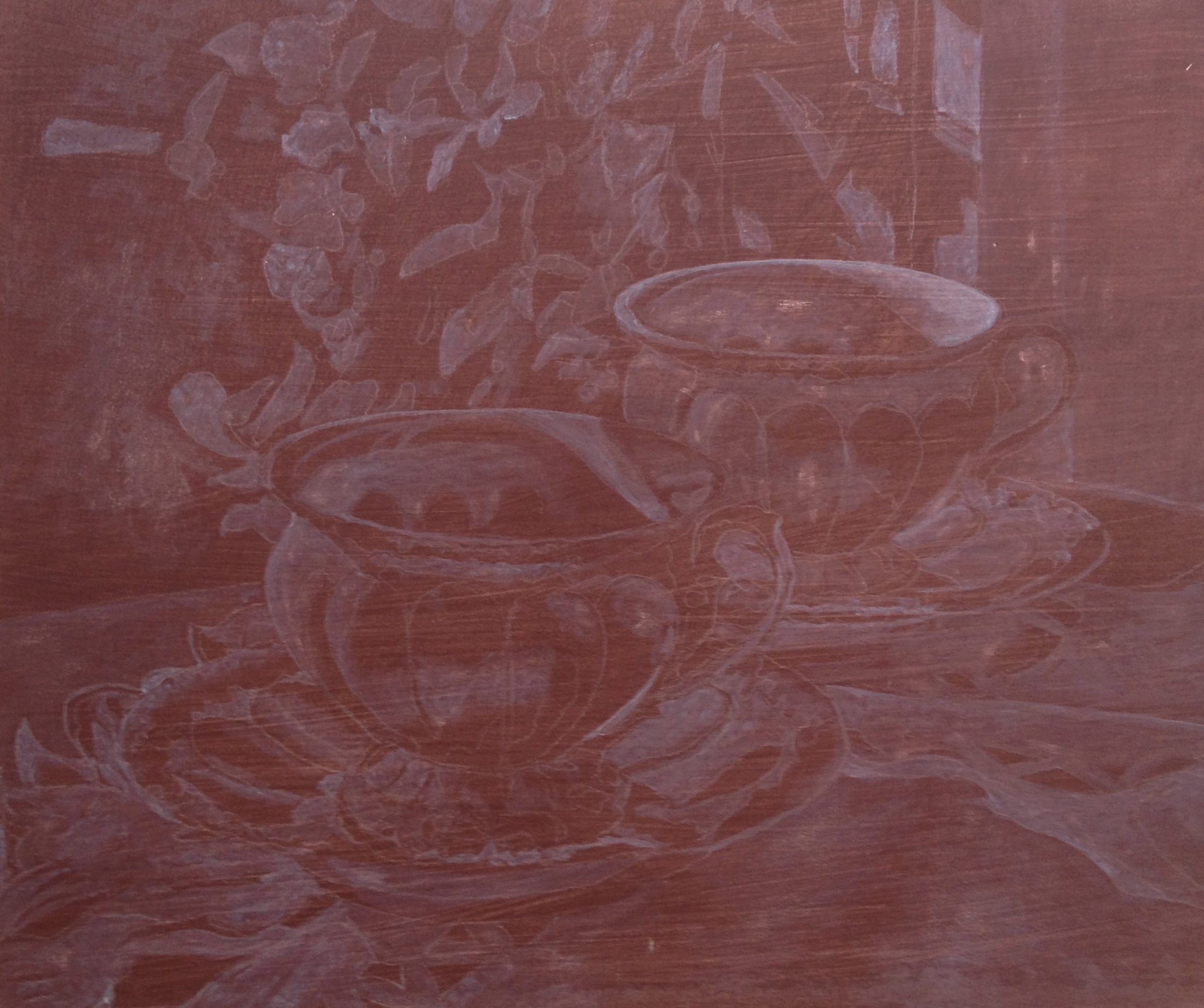 Oleo/creta. Técnica utilizada: Generar una grisalla, intensificar blancos, agregar colores en veladoras construidas con blanco.